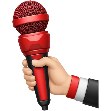 Man with black pulled back hair, wearing a yellow suit and red tie, holding a microphone emoji
