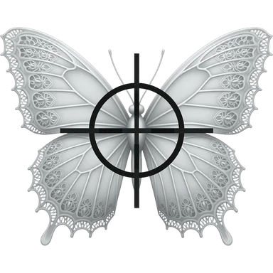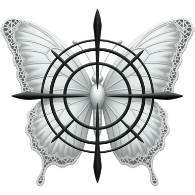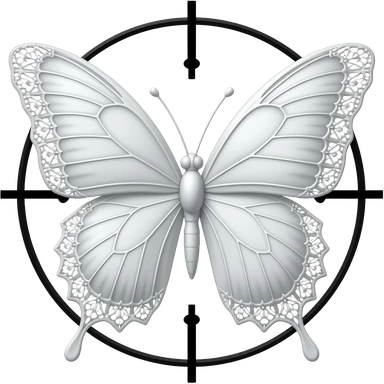 subtle elegant white butterfly, 3D emoji gothic butterfly, white velvet, white filigree, white lace trim, black sniper crosshair emoji