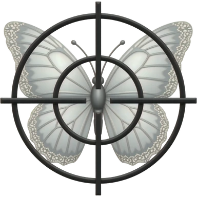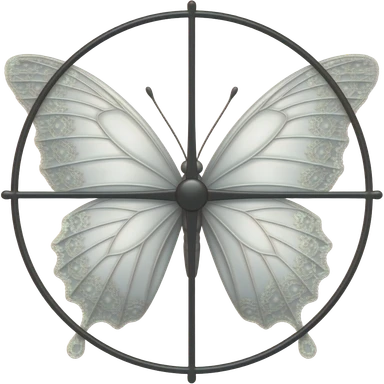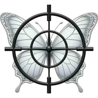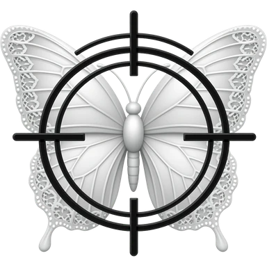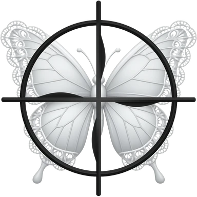 subtle elegant white butterfly, 3D emoji gothic butterfly, white velvet, white filigree, white lace trim, black sniper crosshair overlay emoji