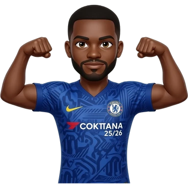 Black man double arm flex wearing Chelsea FC away kit emoji