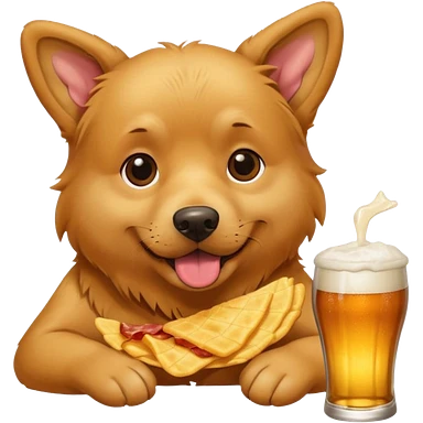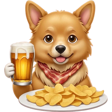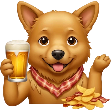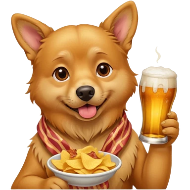 A realistic Dog eating chips and drinking beer on a piece of bacon emoji