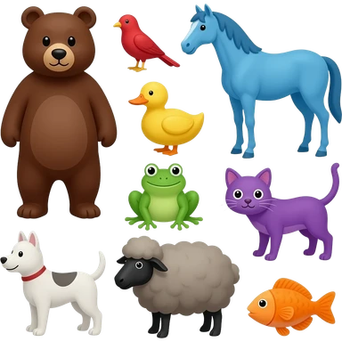 Brown bear, red bird, yellow duck, blue horse, green frog, purple cat, white dog, black sheep, and orange fish emoji