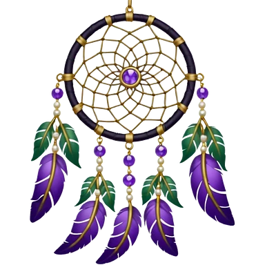 Black dreamcatcher with amethyst crystals, gold pearls, and plants, and violet and white feathers emoji | AI Emoji Generator