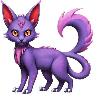 Black edgy Noivern-Noibat-Purloin-Torracat-Lykoi-Caracal-cat-Fakemon-fusion-hybrid-creature with violet and red scale markings, with a scythe-shaped blade-tail-tip emoji