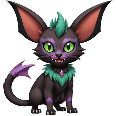 Black edgy Noivern-Noibat-Purloin-Torracat-Lykoi-Caracal-cat-Fakemon-fusion-hybrid-creature with bat head wings, big fangs, gothic markings emoji