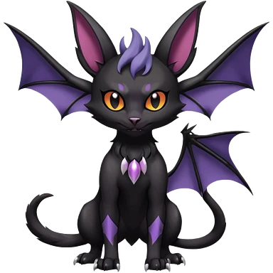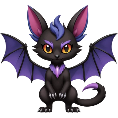 Black edgy Noivern-Noibat-Purloin-Torracat-Lykoi-Caracal-cat-Fakemon-fusion-hybrid-creature with with tufted ears, tufted tail, bat wings as ears, head wings, ear wings, vampiric, batty, violet and red scale markings emoji