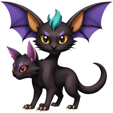 Black edgy Noivern-Noibat-Purloin-Torracat-Lykoi-Caracal-cat-Fakemon-fusion-hybrid-creature with bat wings on head as ears, big fangs, gothic markingsemoji