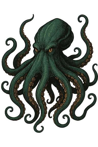 black fierce kraken, tentacles raised, aggressive expression, stylized as a dramatic sea monster, dynamic and detailed illustration emoji