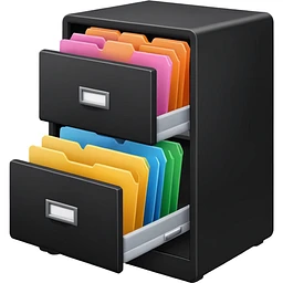 black filing cabinet with open bottom drawer with colorful folders emoji