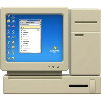 An old 2000s computer, with Windows XP on the screen. Inside the screen, a few tabs are open, including a tab with a happy face. emoji