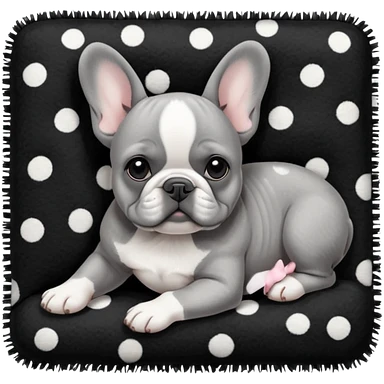 Gray French bulldog puppy with white belly, wearing black and white polka dot bow, taking a nap on a black color fuzzy rug emoji