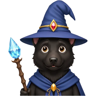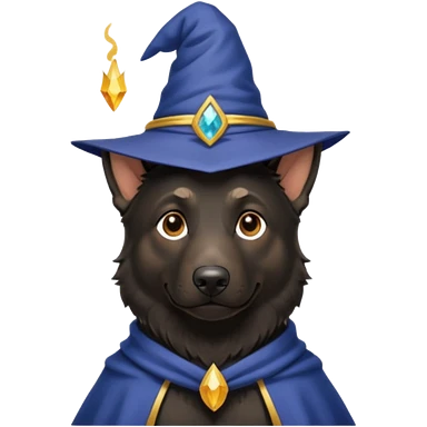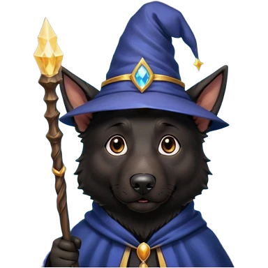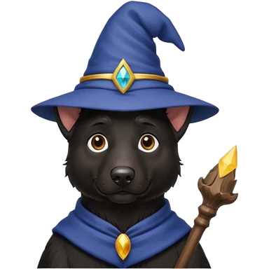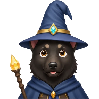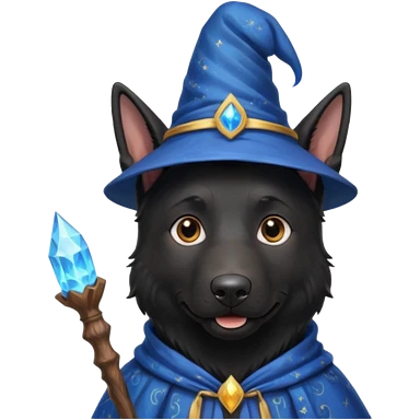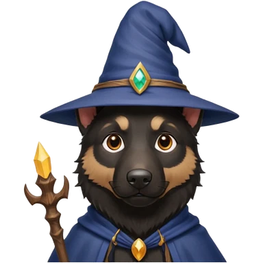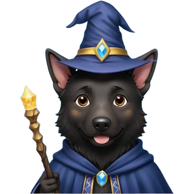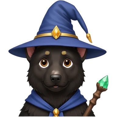 all black german shepherd face wearing a wizard hat and staff emoji