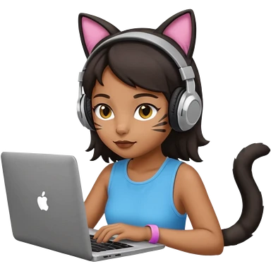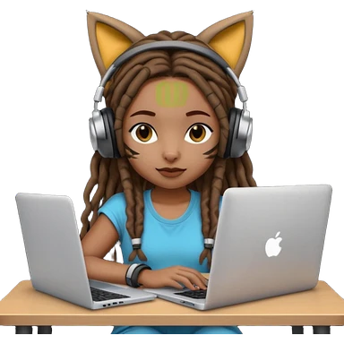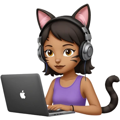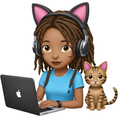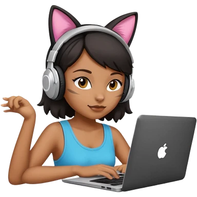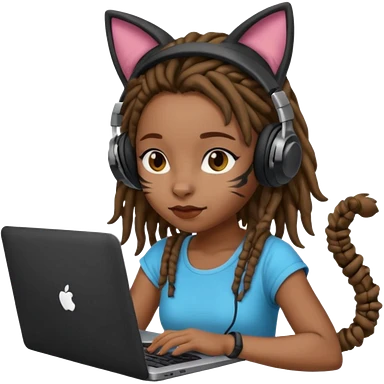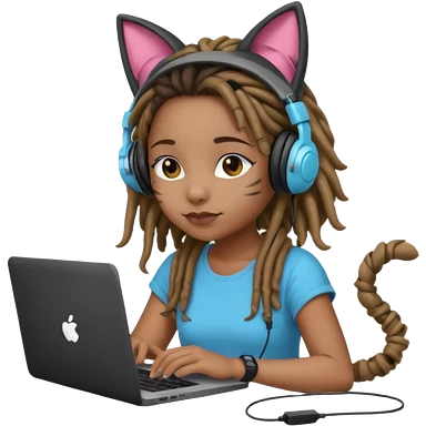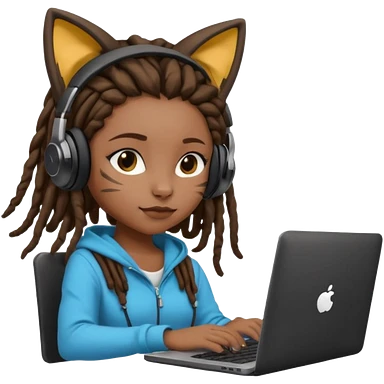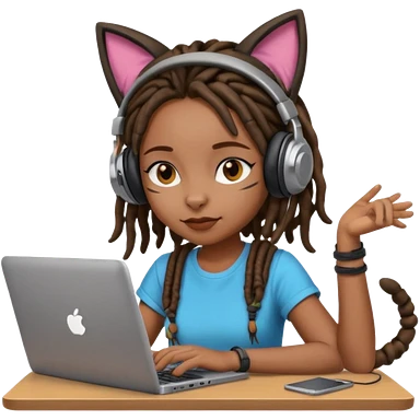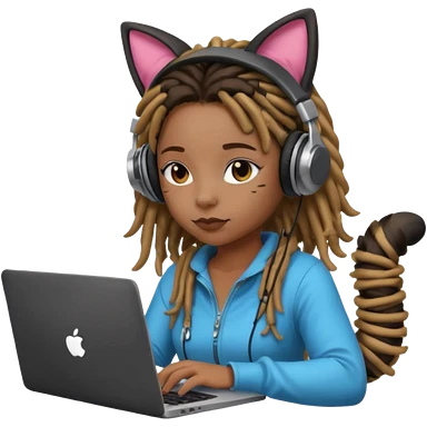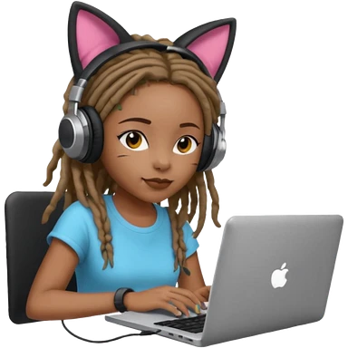 black girl with dreads who works remotely through a laptop with headphones that have plastic cat ears connected to the headphones. emoji