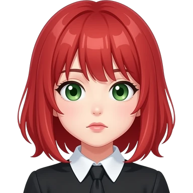 anime girl, up turned lip, red hair, green eyes, black blouse with white collar emoji