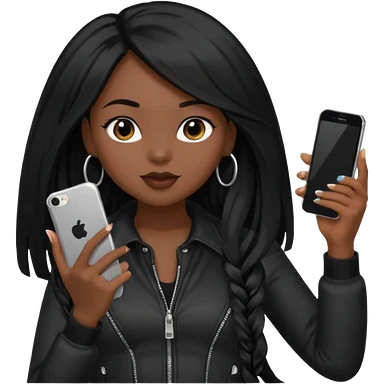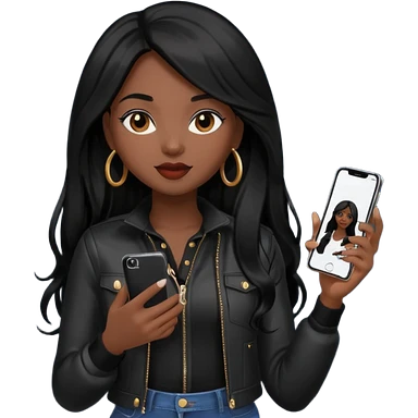 influencer girl black long haired, phone in hand, recording herself, confident, trendy, emoji