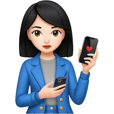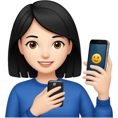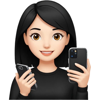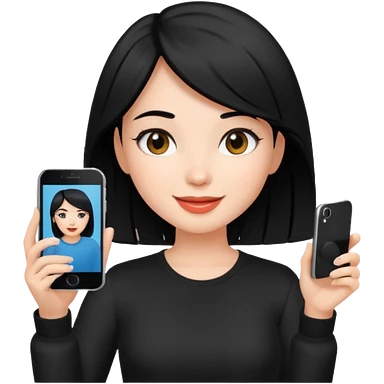 influencer girl black haired, phone in hand, recording herself, confident, trendy, emoji