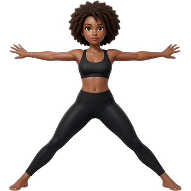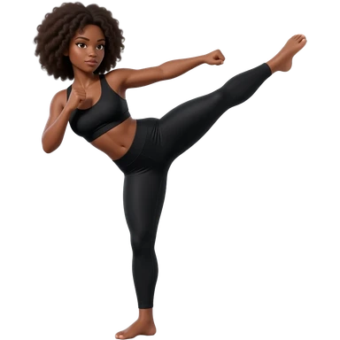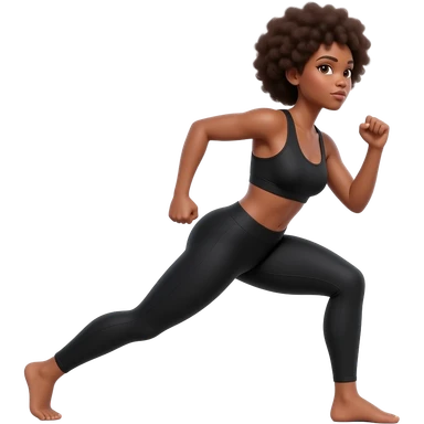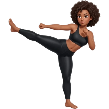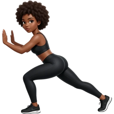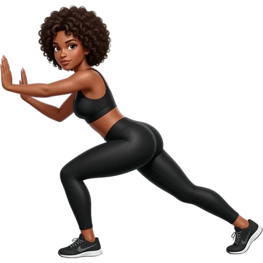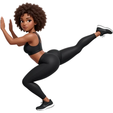 Light-brown Black woman, afro hair, wearing black sports bra and leggings, performing KICKBACK STANDING , full body, toned glutes and legs, strong posture, realistic fitness style, clean background, soft lighting. emoji