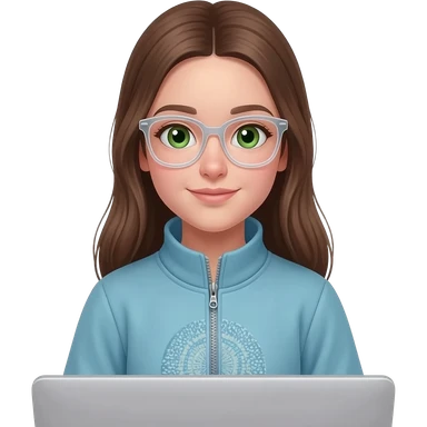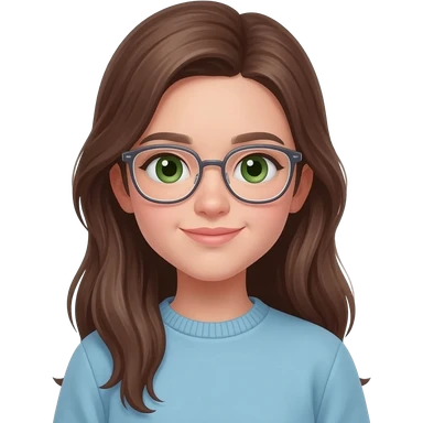 15 year old girl,long brown hair, clear glasses, and green brown eyes, and her in a computer, with a light blue lululemon sweater emoji