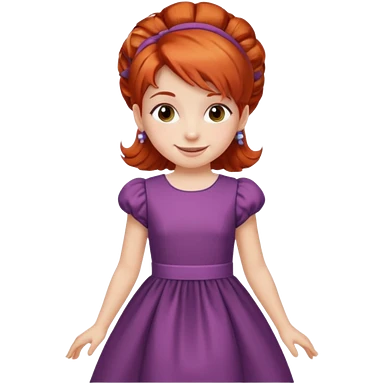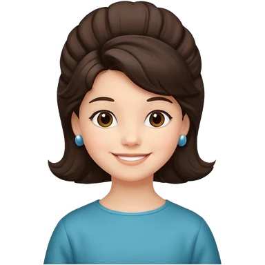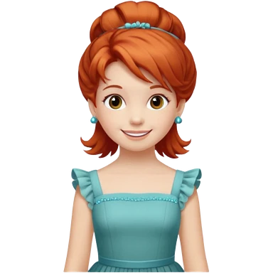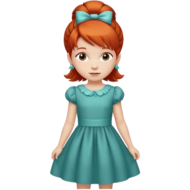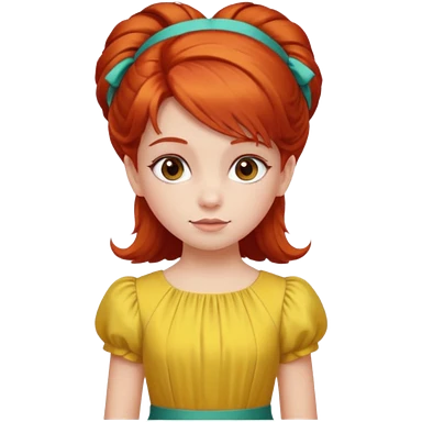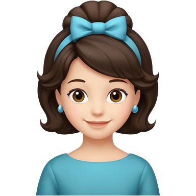 pale girl with chest-length straight brown hair, bangs above the eyebrows covering the forehead, brown eyes, red lips, V-shaped face, small thin nose, almond eyes, wearing a white bouffant dress emoji