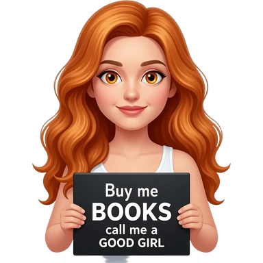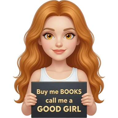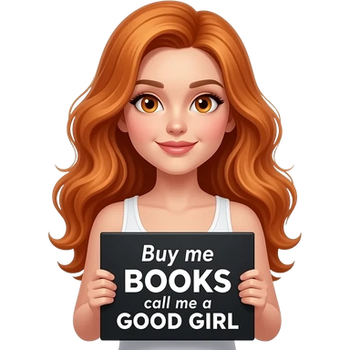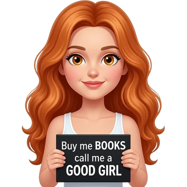 sexy girl with long wavy ginger hair and ginger eyes wearing a white tanktop is holding a black colored sign with GOOD GIRLS love reading DIRTY BOOKS written on it emoji