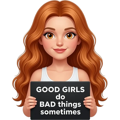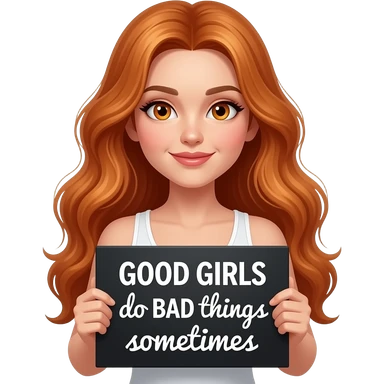 sexy girl with long wavy ginger hair and ginger eyes wearing a white tanktop is holding a black colored sign with GOOD GIRLS do BAD things sometimes written on it emoji