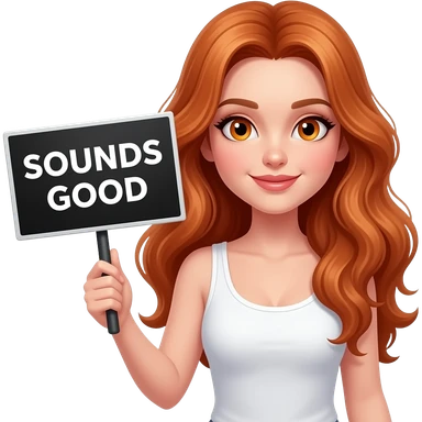 sexy girl with long wavy ginger hair and ginger eyes wearing a white tanktop is holding a black colored sign with SOUNDS GOOD written on it emoji