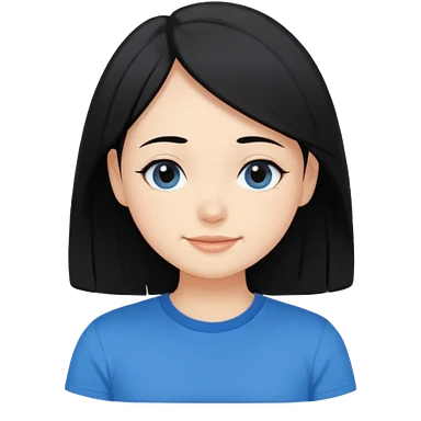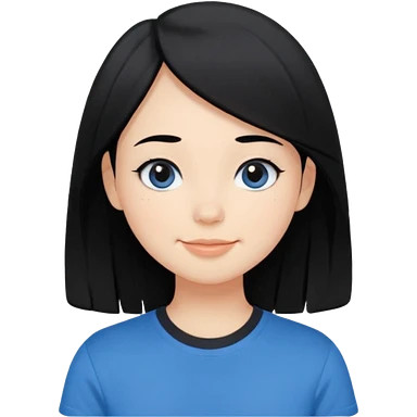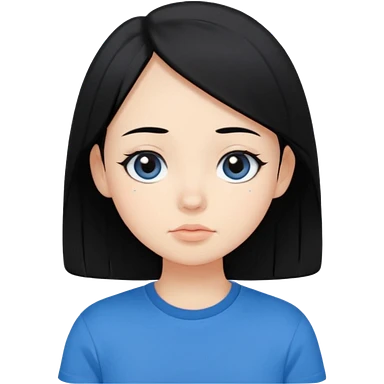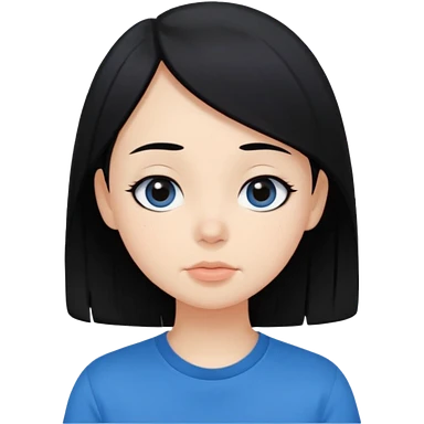 Cute cartoon-style girl portrait, black hair, blue t-shirt, big black eyes, closed mouth,clean bold lines, flat colors, minimal shading emoji