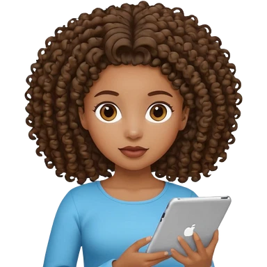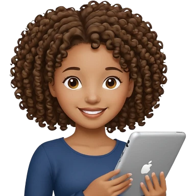 Dark brown Black girl with curly ponytail holding ipad emoji