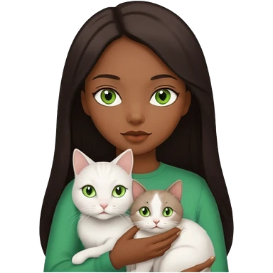 black girl with brown eyes with straight long black hair with a side part. holding a female white cat. the cat has green eyes emoji