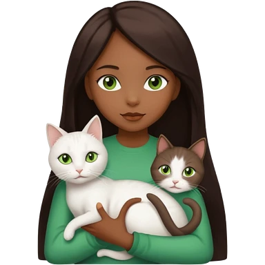 black girl with straight long dark brown hair with a side part holding a female white cat with green eyes emoji