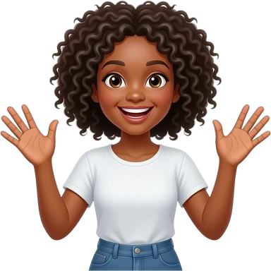 Black Girl with both hands open in the air. Happy, frontal view above waist only emoji