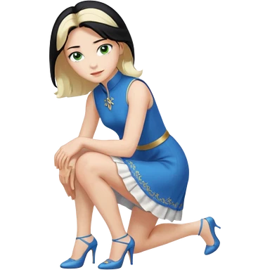 prince, upright, black Hair, blue eyes, garment, and woman, bending knee, sleveless white dress, blonde hair, green eyes, emoji