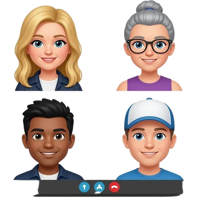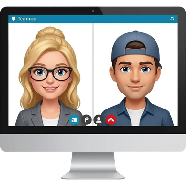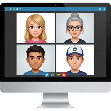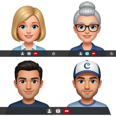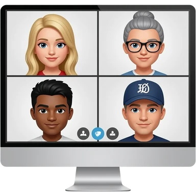 virtual meetings on computer screens amongst 4 teammates: 2 girls (1 blonde, 1 ash gray with updo and black-framed glasses), 2 guys (1 with black hair, 1 with ballcap) emoji