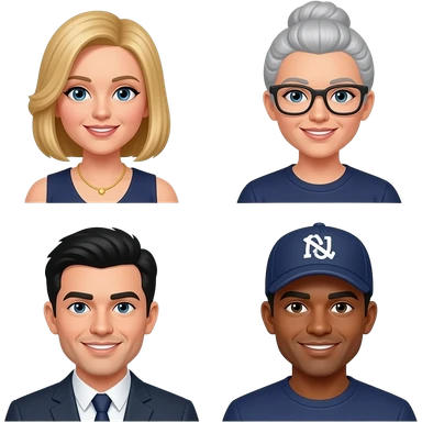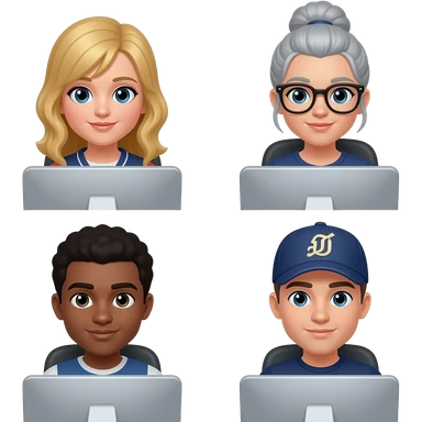virtual meetings with computers amongst 4 teammates: 2 girls (1 blonde, 1 ash gray with updo and black-framed glasses), 2 guys (dark hair, 1 with ballcap) emoji