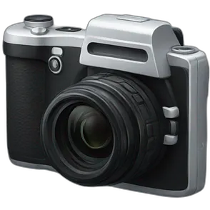 Black professional photo camera, large lens, clear photo shot in the background, sleek design, minimalistic, on a white background, no extra details. emoji