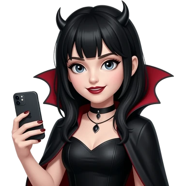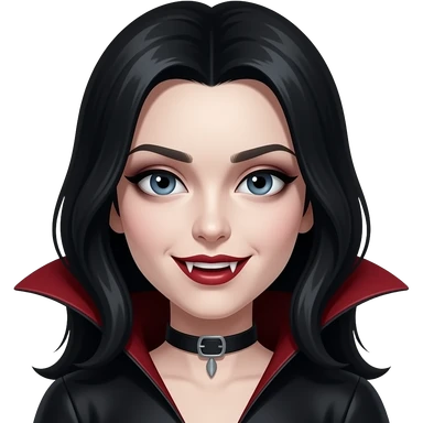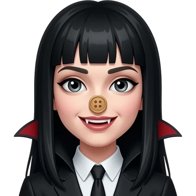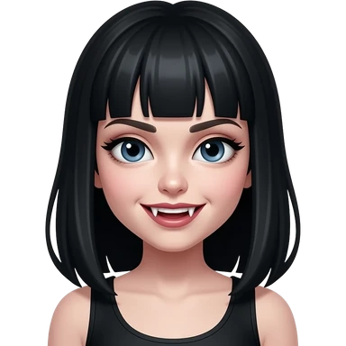 Black hair vampire girl with button nose facing forward with fangs showing emoji