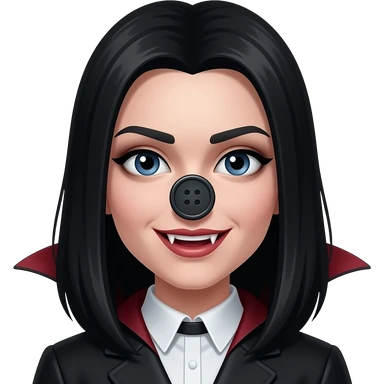 Black hair vampire girl with button shaped nose facing forward with fangs showing emoji