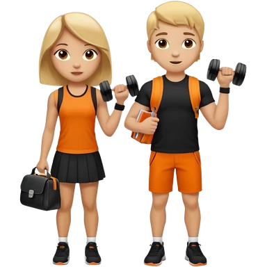 light skin students girl and boy with school bag full of books on hand and dumbell in other hand. Clothes are in black and orange colours. They are going to the gym. They have brown and blonde hair. Dumbell is visible in hand. They are teaching about sport emoji