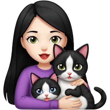 girl with straight black hair cuddling black and white cat with tongue out emoji
