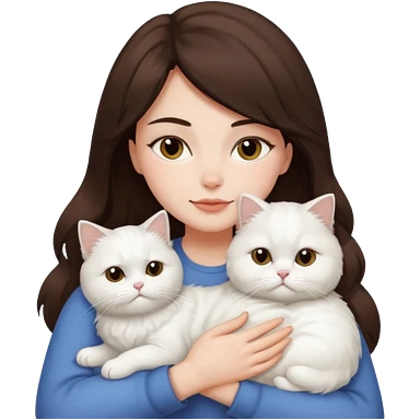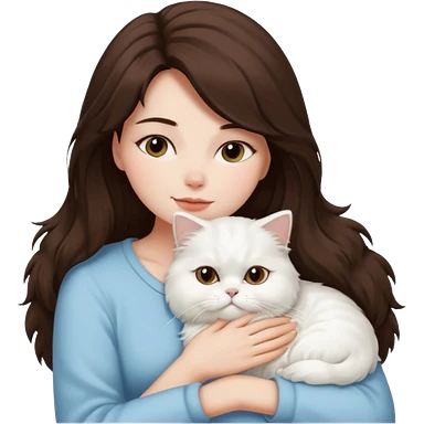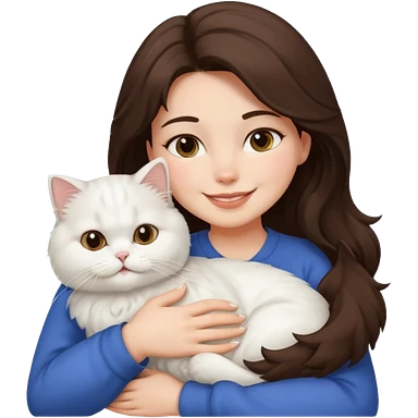 Brunette woman snuggling white Persian cat with blue eyes emoji