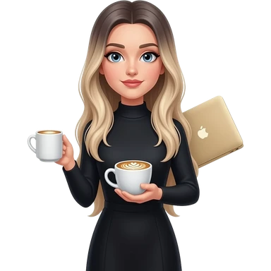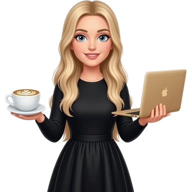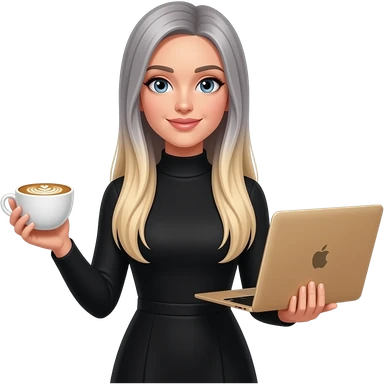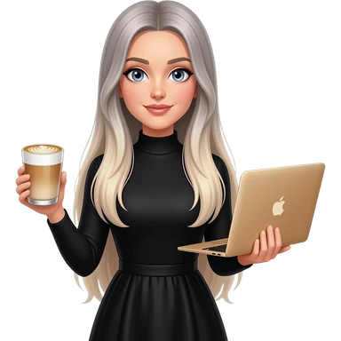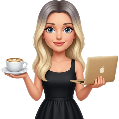 Beautiful white girl, with dark very long hair with bang, wearing black Chanel shirt, holding MacBook emoji