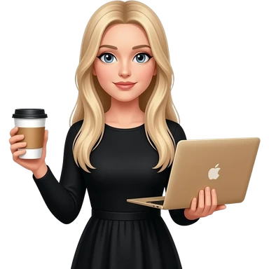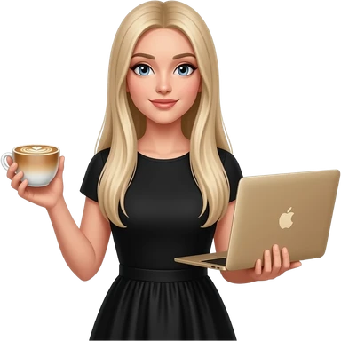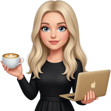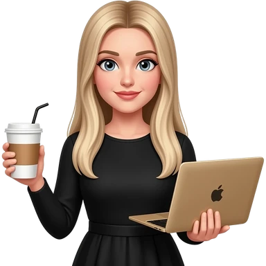 A girl with fair skin, light hair and blue eyes in a black shirt holds a rose gold MacBook emoji