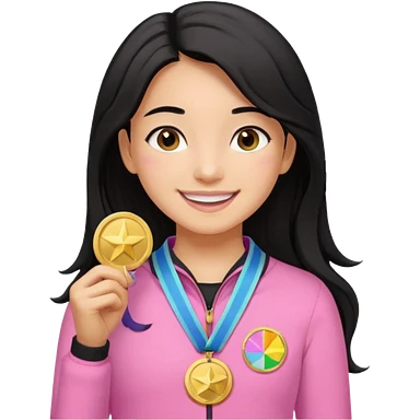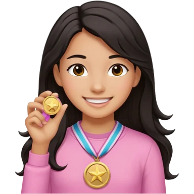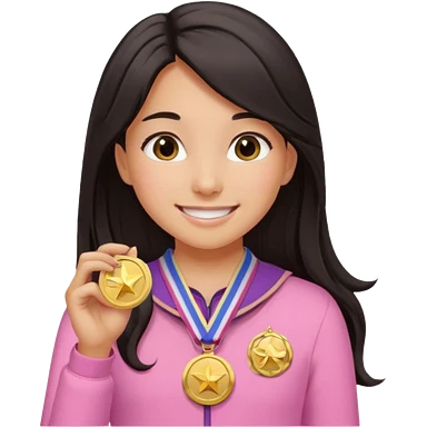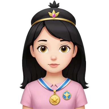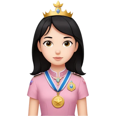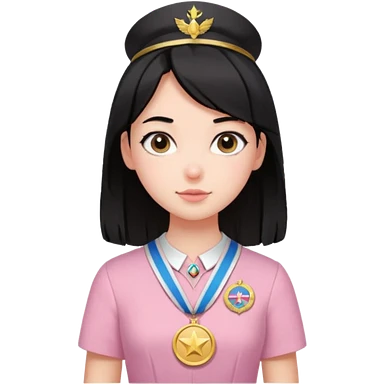 black haired girl wearing pastel pink with medals remove any hats, make her smile, make her hair longer emoji | AI Emoji Generator