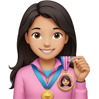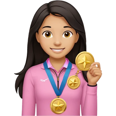 black haired girl wearing pastel pink with one medal, remove any hats, make her smile, make her hair longer, make her tan emoji
