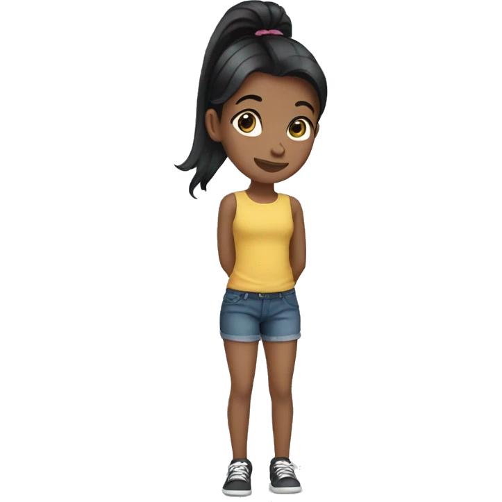 black curly-haired fair Indian girl, ponytail, yellow kurti, smiling emoji