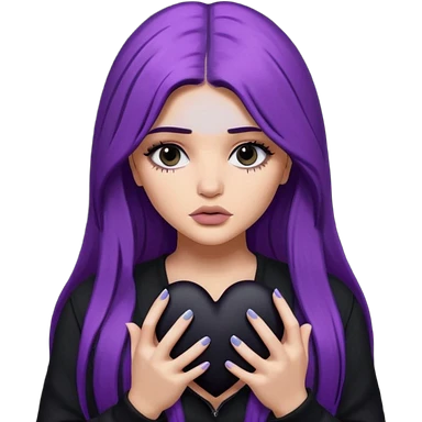 Pale girl with long black hair holding black heart in her hands emoji