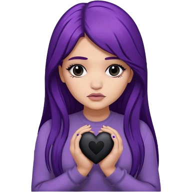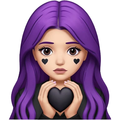 A Kylie Jenner with long purple hair is sad and holds a black heart in her hands emoji