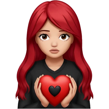 A Kylie Jenner with long red hair is sad and holds a black heart in her hands emoji