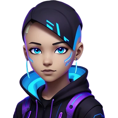 "A highly detailed futuristic digital avatar of a young graphic designer. Cyberpunk-inspired, wearing a sleek black hoodie with neon blue and purple accents. The character has sharp features, a confident smirk, and glowing eyes (one blue, one purple). The background is dark with abstract lighting, giving a professional and mysterious vibe. The art style is a mix of ultra-realistic and sci-fi digital painting, high resolution emoji