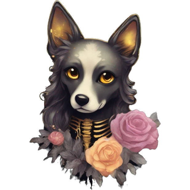 Black iridescent fluffy dog fox head zombie skeleton gold mechanical nebula galaxy stars flowers fairy lights vintage emoji
